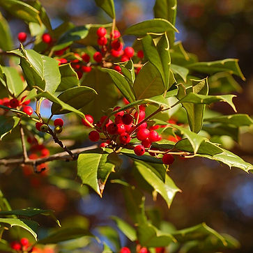 American Holly is an evergreen tree with spiky, glossy leaves and red berries.